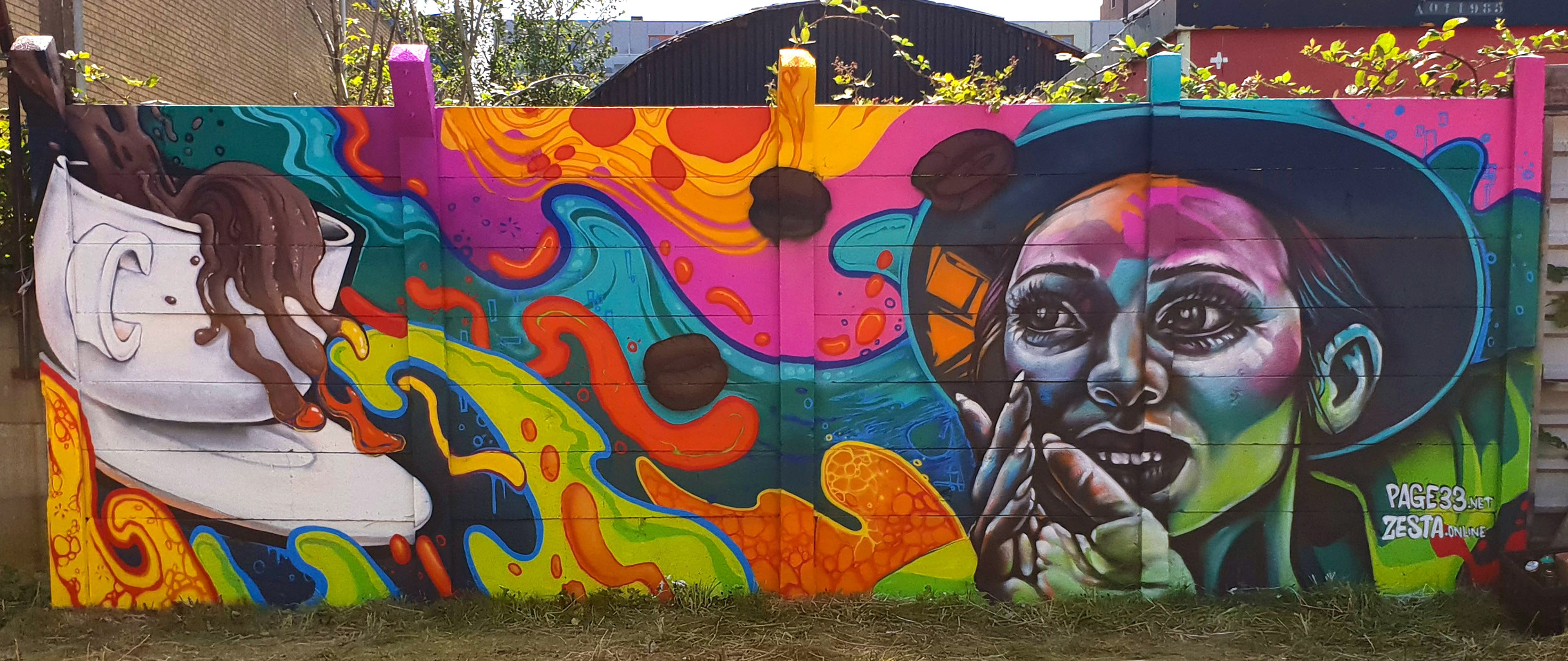 Colourful wall painting for Capriole Cage in Binckhorst, painted with Page 33.