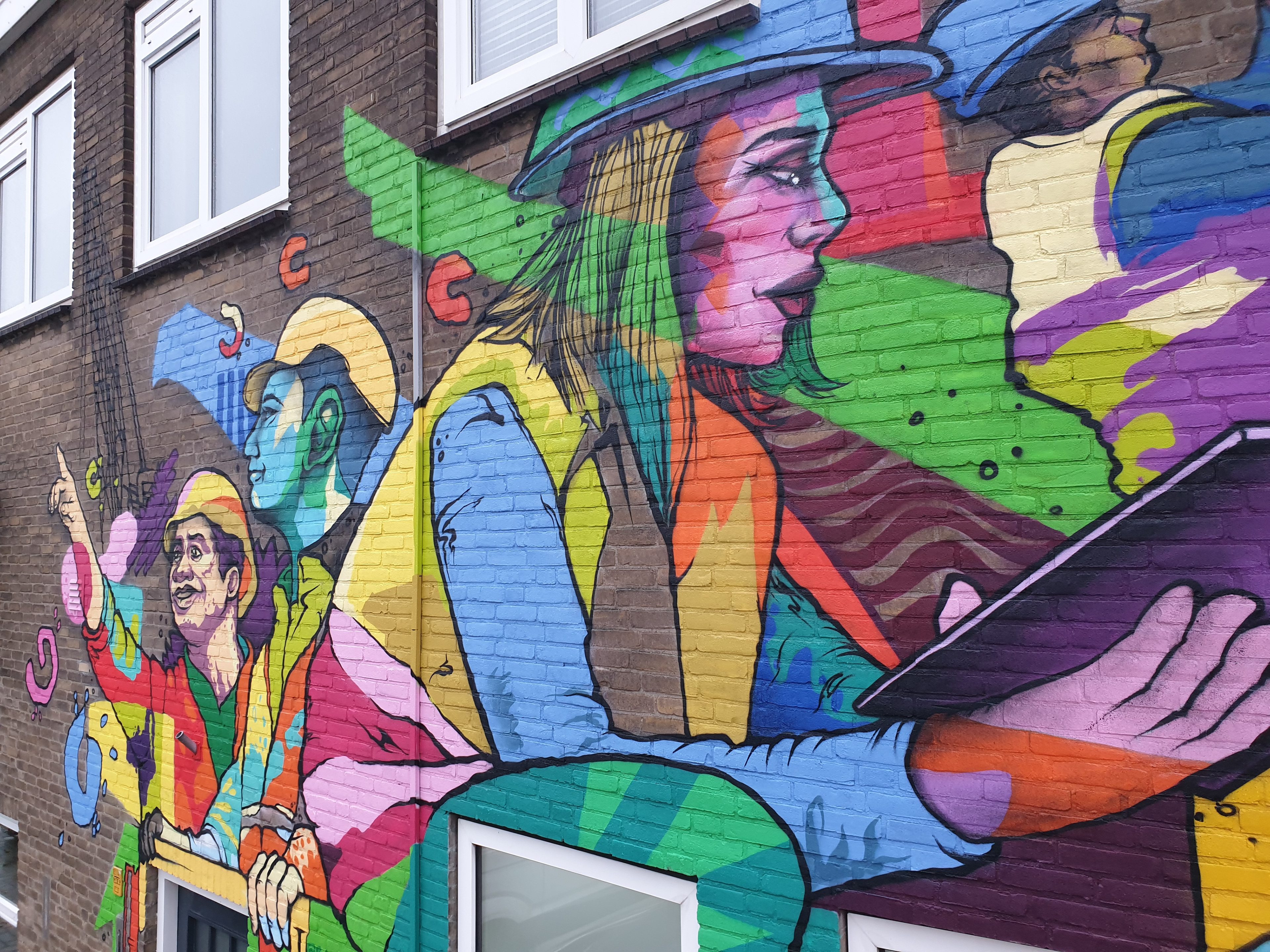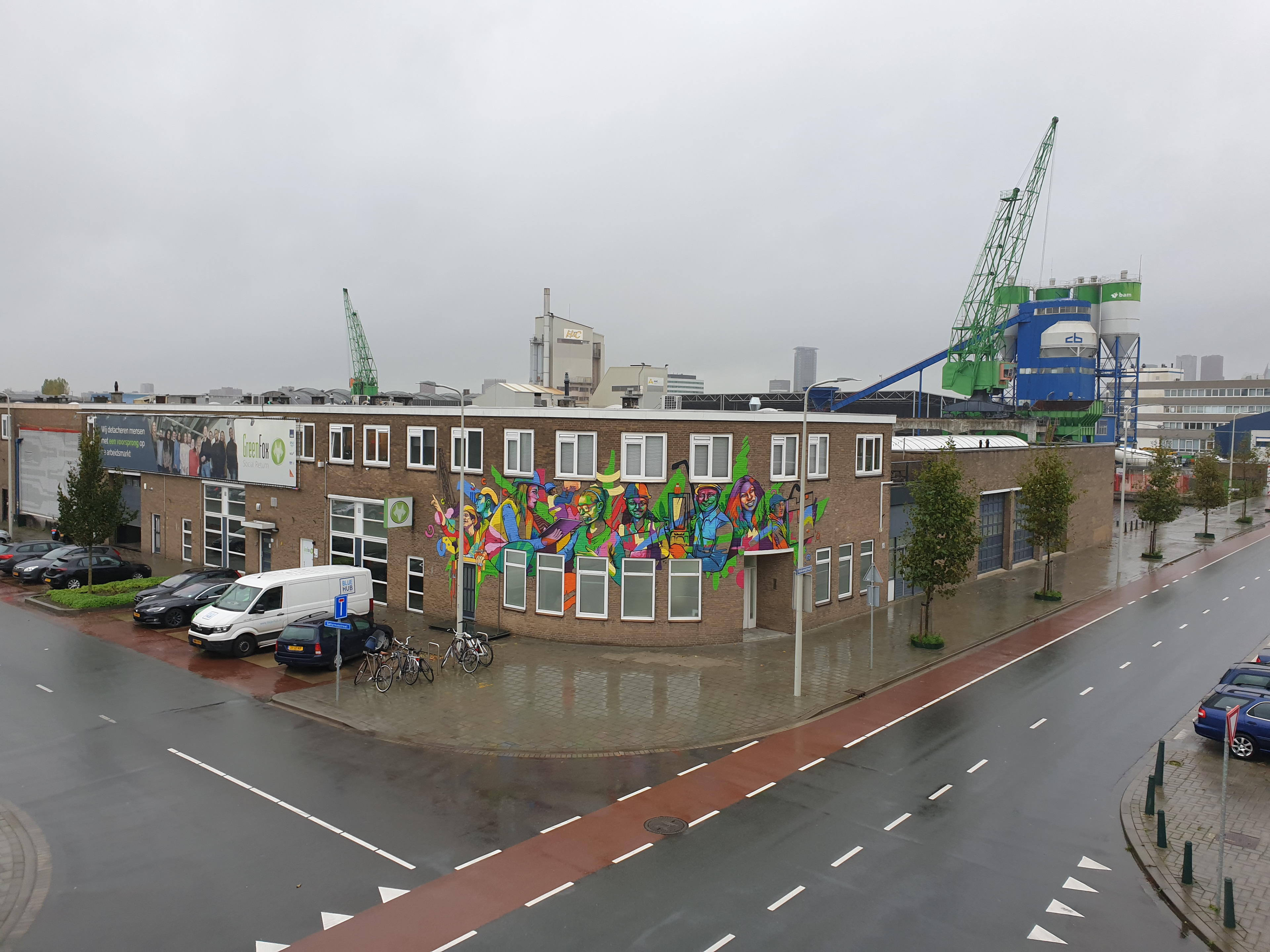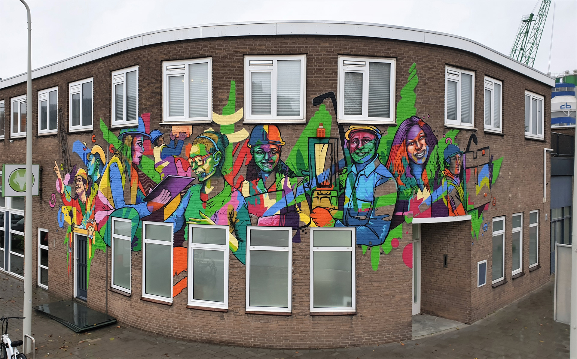 Mural project for Green Fox Social Return in Binckhorst, Den Haag. Mural design and painting by Zesta and Page33 in collaboration with StreetArtProjectsNL.