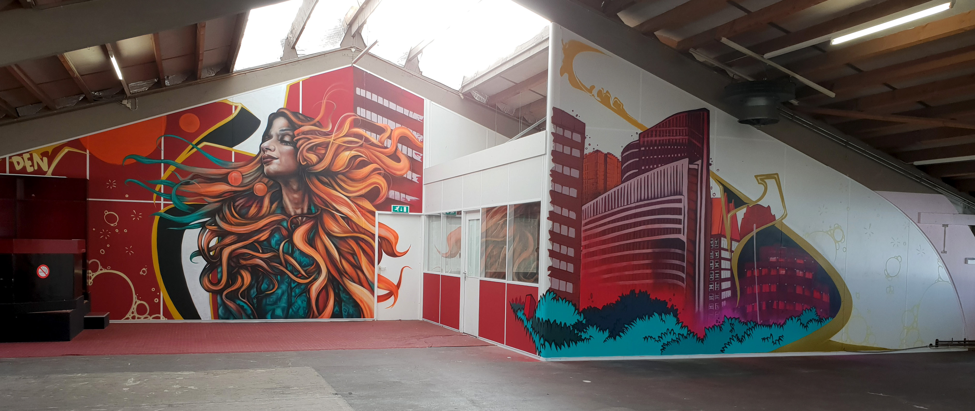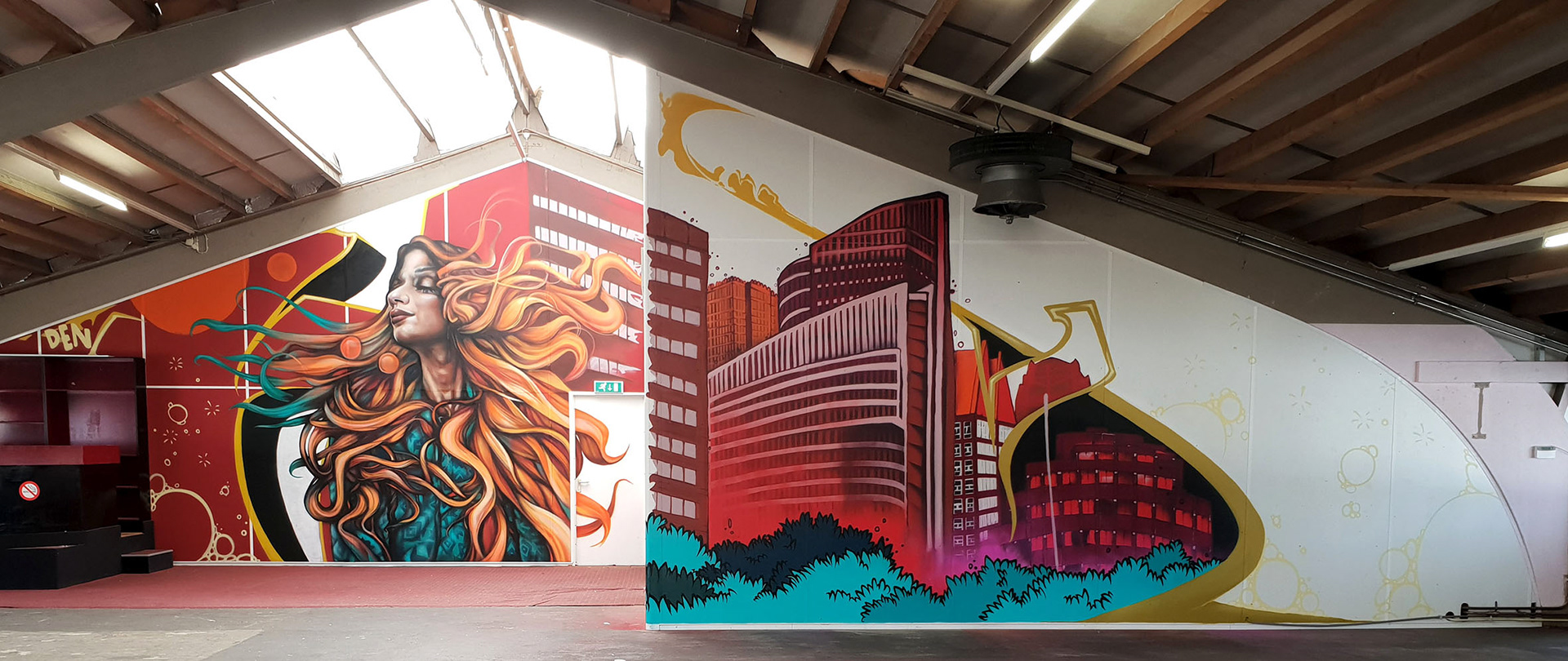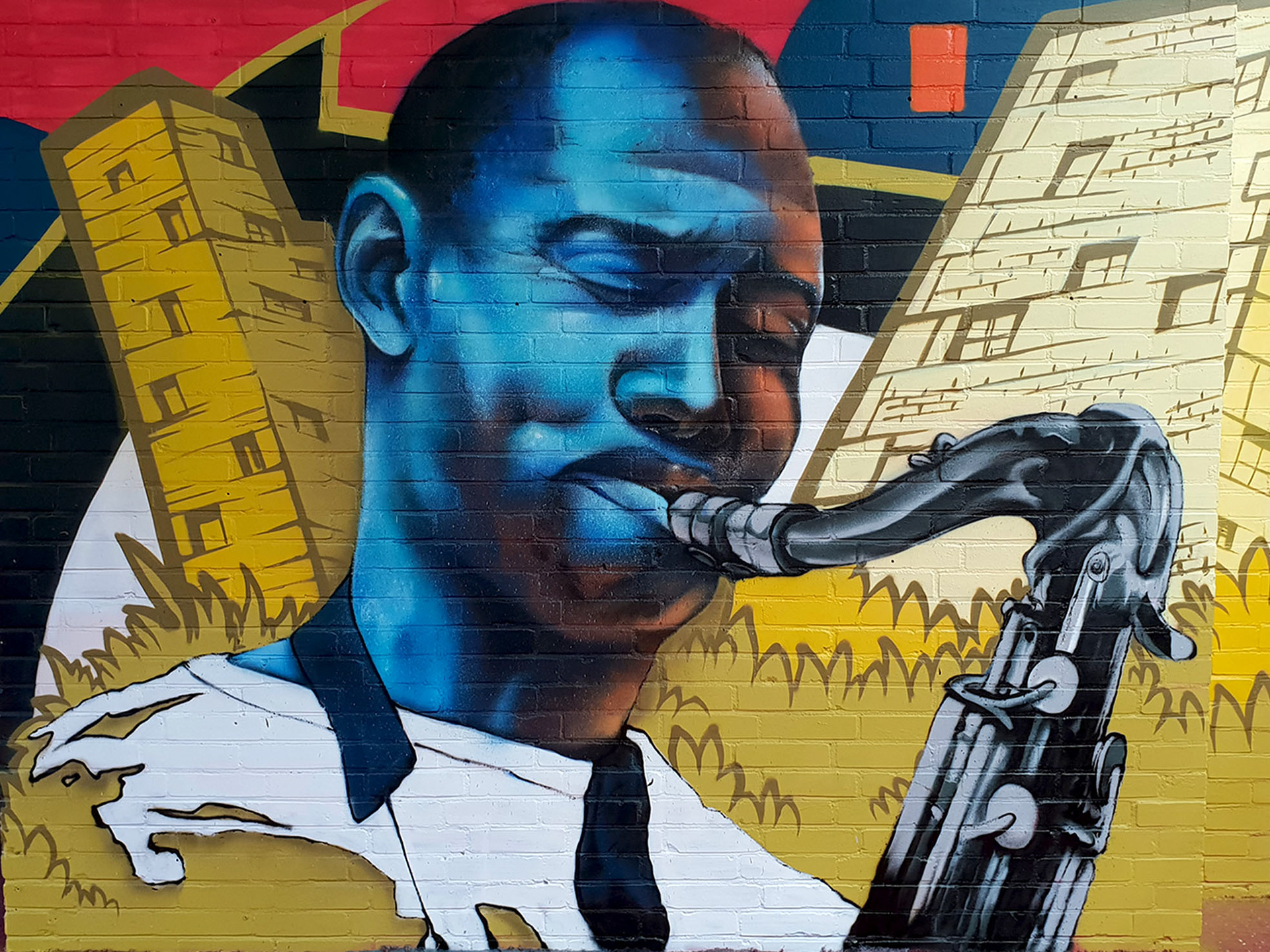 mural of blue's musician playing a saxophone, blue and orange coloured lighting